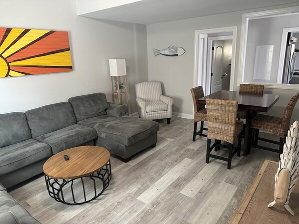 Our living room has a brand new sectional with a full pullout bed with memory foam mattress. A new 55" smart TV with Netflix and Roku included.
