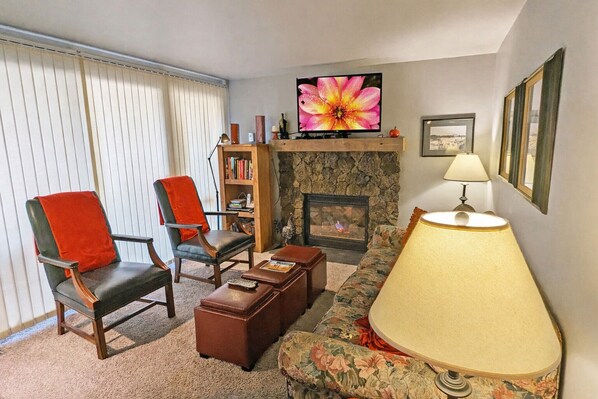 - Main floor features a cozy living room with a gas fireplace and flatscreen TV