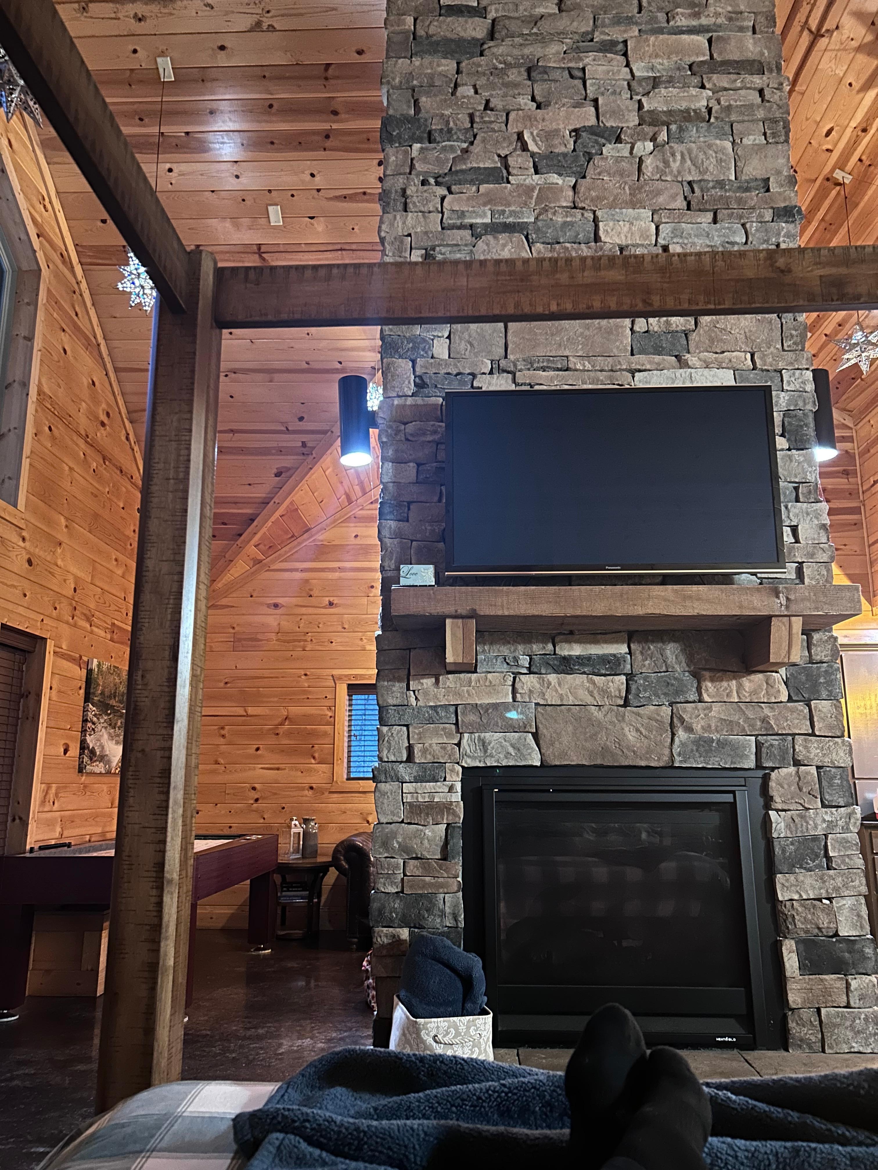 The living area boasts a large and comfy weathered leather couch that faces a dual-sided gas fireplace and Roku-enabled TV, along with an ottoman to kick up your feet and relax while watching the TV or a peacefully glowing fireplace. For additional guests, a queen-size air mattress with fitted sheets and blankets is also available.