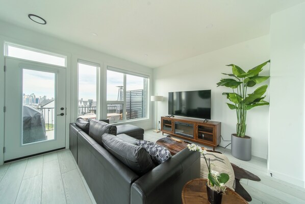 Living Room: Relax in the cozy living room with a comfortable sofa bed, 65 inches flat-screen google smart TV with Netflix and Disney+ available for entertainment.