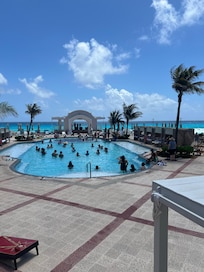My family and I stayed for 7 nights and enjoyed the week. Very friendly staff and great service. Rooms were clean and spacious. Bed was good but pillows were a little thick but luckily with 4 to choose from my wife and I had a pillow that was soft enough to be comfortable. We didn't spend any time at the adult pool except for walking by. Pool looks very clean and there is music, games, water arobics and some backyard games for both kids and adults on the side. We spent our days playing in the BEAUTIFUL blue ocean water and enjoying the soft white sandy beach with a bar within 10 seconds of where the beach chairs are located. Beach volleyball is alot of fun on the beach. I wish my kids were still under 12yrs old because the kids pool area looks like alot of fun. Makes me excited to be a Grandpa in the next few yrs. Unfortunately waiting in lines for meals is something we weren't really ready for. We are use to bigger resorts with little to no waiting. The food was good. The bar tenders are very good and quick. A few tips and they already know what you want when they see you coming. Nightly entertainment was downstairs and inside an auditorium and we didn't want to be inside. The bar has live music but we really enjoyed the patio looking out over the adult pool area. 24/7 coffee shop was nice. Lots of options and they make great sandwiches.