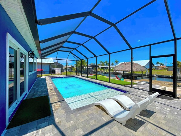 Bright, single-story gulf-access canal home in Cape Coral near Yacht Club Beach with a screened pool, private dock, kayaks, bikes, grill, fast Wi-Fi, and peaceful water views.