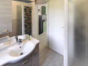 "Dora", 3-room terraced house 58 m2 on 2 levels. Bright, comfortable furnishings: living/dining room with satellite TV and air conditioning. Exit to the terrace. Open kitchen (dishwasher, 4 induction hot plates, toaster, kettle, microwave, freezer). Shower/bidet/WC. Upper floor: 1 double bedroom with air conditioning. Exit to the balcony. 1 room with 2 beds. Electric heating. Balcony 10 m2, terrace 19 m2, roofed. Terrace furniture. Facilities: washing machine, iron, mosquito net. Internet (WiFi, free). Parking (fenced 1 car) at the house, width 230 cm. Please note: suitable for families, not suitable for small children. Non-smoking house, parking space for small car only. Private entrance. IT038006B4KCD3WF7D