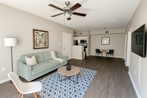 Guests have access to their unit, the fitness center, and the seasonal pool. Guests will be able to view the check-in info on their arrival date. This info will include a code for your unit as well as parking details.