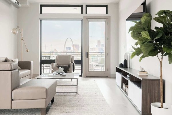 The Tesoro lives up to its name as this property is truly a treasure. Each level features an earth tone accent color that brings personality to each unit. Neutral, clean line furnishings anchor each room. Thoughtfully curated modern, minimalist art brings each space to life while creating a tranquil environment. A refined selection of organic décor creates a soothing sanctuary-like setting in the heart of Denver. Still, swank city energy and innovation resonate from the stone waterfall countertops and top-of-the-line stainless steel appliances and laundry set.