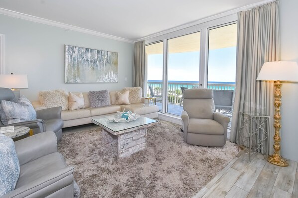 The master bedroom has incredible beach views and private access to the beachfront balcony. Complete with a king bed, flat-screen TV, and private ensuite bathroom, the master bedroom was designed with relaxation in mind. The master bathroom features a jetted tub, walk-in shower, and a granite double vanity. The first guest bedroom has a king bed, a flat-screen TV, and private access to the beachfront balcony. The first guest bedroom also has a private bathroom with a walk-in shower. The second guest bedroom has a full bed, a full over full bunk bed, and a flat-screen TV. Just steps from both the second guest bedroom and the living area is a full bathroom with a walk-in shower.