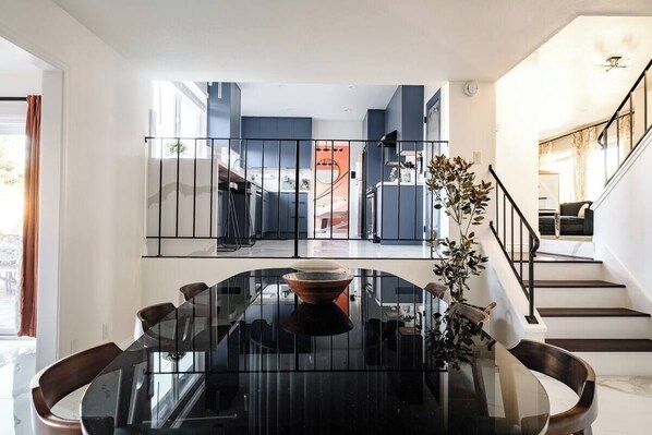 ⭑Kitchen and Dining Area⭑ ✔ Fully equipped kitchen with electric stove, refrigerator, microwave, and dishwasher. ✔ Cooking basics, including pots, pans, oil, salt, and pepper. ✔ Coffee maker Keurig, blender ✔ Elegant dining table for family meals. ✔ Fridge, freezer, stemless wine glasses ✔ SMEG toaster