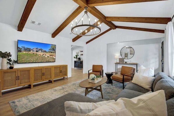 Welcome to Bubbles on Bowie, ideally located just 3 blocks from Main St. Fredericksburg! When you get here, pour a celebratory glass of rosé and explore this charming property and lovely outdoor space with a fire pit for sipping one last glass after sunset. Every room shines with Hill Country modern design, from the beamed ceilings and custom tilework to the clean-lined furnishings and gold accents throughout.