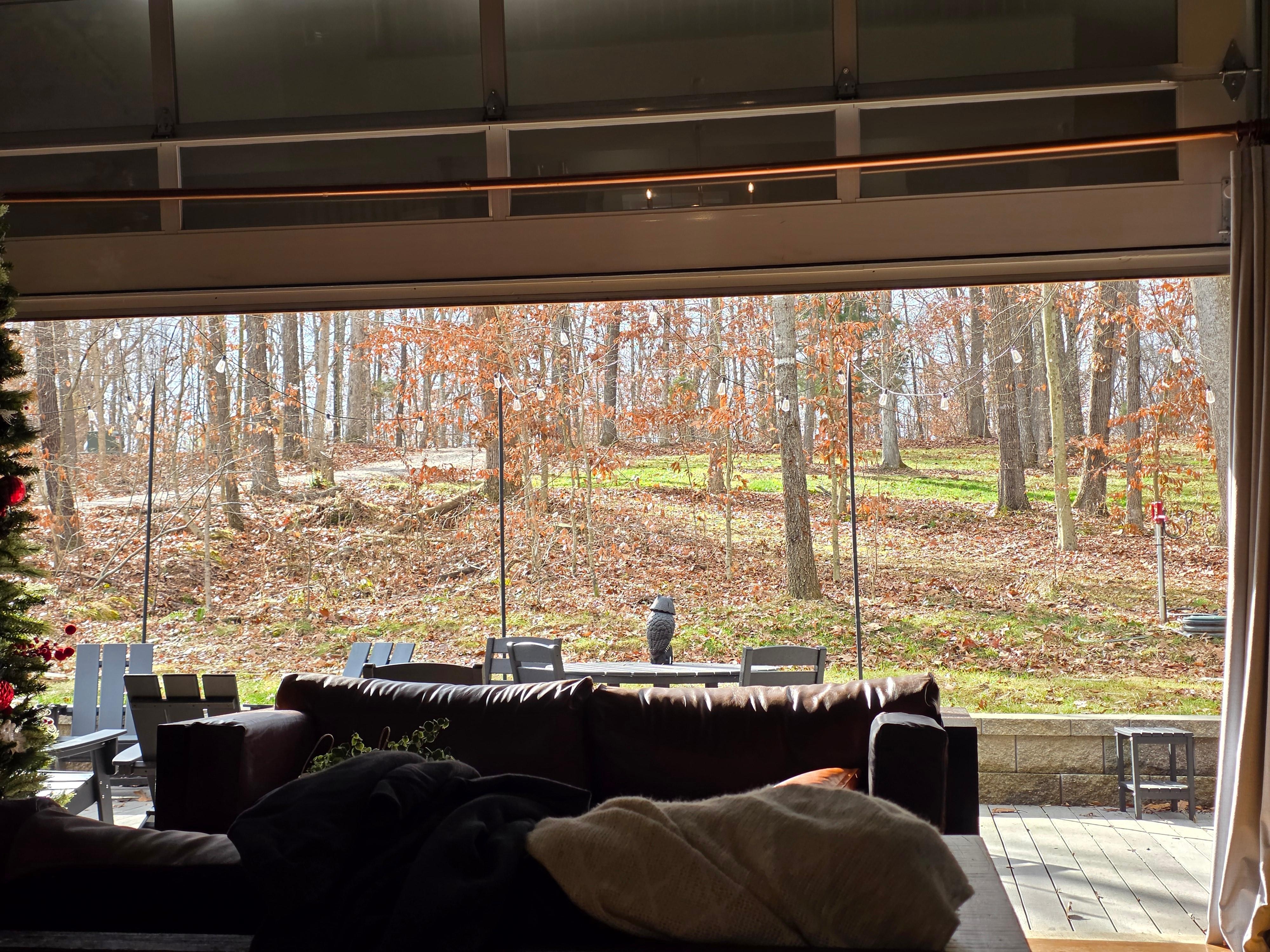 Seamless indoor-outdoor living – an oversized door opens to the fresh forest air, making it easy to gather indoors or out