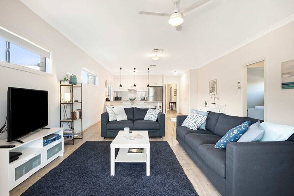 Brookings Perch offers a spacious and stylish retreat, perfect for families or small groups. The open-plan living, dining, and kitchen area is designed for comfort and easy entertaining, featuring quality furnishings and ample space to relax or enjoy meals together. The kitchen comes fully equipped with modern appliances, cookware, and dishware, making it easy to prepare meals at home. The dining table seats 6, with additional seating at the kitchen counter for casual meals or conversations.