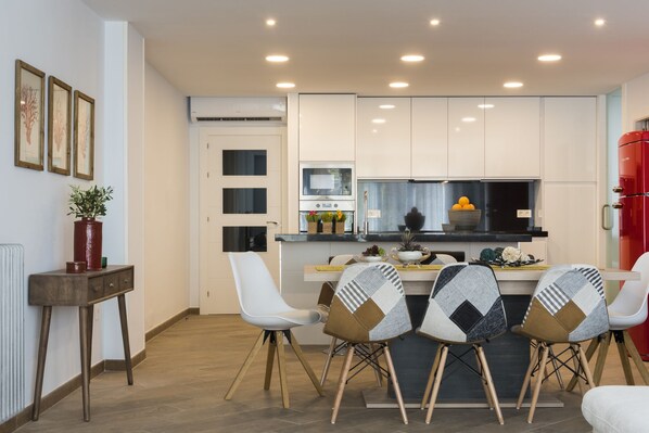 La cocina, completamente remodelada, combina diseño y funcionalidad: encontrarás electrodomésticos de última generación y todos los utensilios necesarios para preparar desde un desayuno rápido hasta una cena gourmet. Además, el apartamento dispone de otros tres baños completos, decorados con azulejos artesanales y equipados con toallas de calidad hotelera.