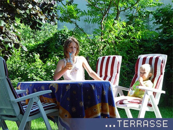 The apartment has an area of 80 m² and stretches over 2 levels. It offers enough space for max. 8 people. In the lower level you have a living room with sofa bed for 2 persons and integrated dining area overlooking the fireplace, kitchen, bathroom and a bedroom with a double bed for 2 persons. In the upper level there is another bedroom for 4 people with 2 single beds and each extendable lower beds for 2 more people. In the spacious kitchen, you can easily enjoy your morning coffee and have to worry about washing up not to worry, as this love takes over the dishwasher for you. The bathroom is equipped with bathtub and integrated shower and a washing machine. In the closet you can not stow needed things. The evenings can be enjoyed in the living room by the fireplace, in the garden in your sitting area at the BBQ or use the sauna house with the cozy Finnish sauna. Directly before the house there is a carport with shed available. In it you will find garden furniture and children's toys of course a barbecue for free use. A children's playground with climbing frame can also be shared. Bicycles can be rented for exploring the surrounding area.