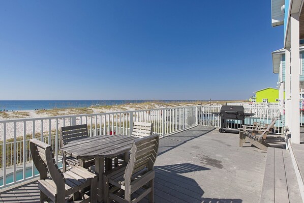 Triple Seas is packed with amenities to enhance your vacation. Spend your days lounging by the private pool, grilling on the deck, or relaxing under the stars. Each bedroom includes a TV and DVD player for indoor entertainment and the open concept living room with vaulted ceilings and Gulf views offers the perfect place to unwind after a day in the sun.