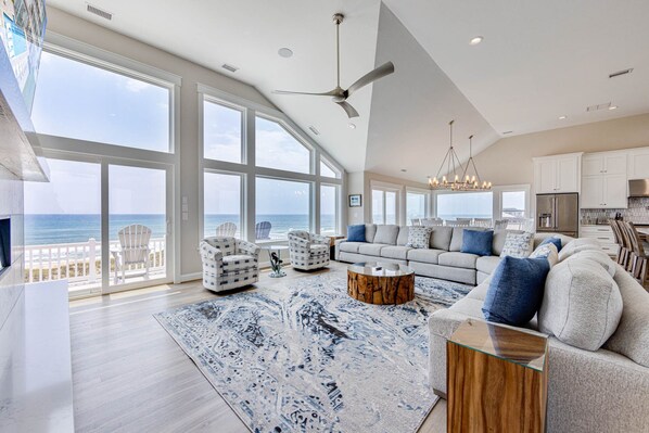 The home’s third level reveals two spacious master king suites both with dramatic-tiled bathrooms and direct deck access. The larger of the two features two swivel recliners, a fireplace, convenient table and chairs, a window seat, and triple shower heads in the ocean view shower. The great room, also found on this level, is a stunning space that delights with a soothing palette, artful touches, and the ideal synergy to bring everyone together. A gourmet chef’s kitchen addresses the challenge of feeding a crowd with two sinks, double microwaves, and stoves, two dishwashers, two refrigerators, an icemaker, a spacious center island that seats eight, a large pantry, and plenty of counter space for preparing and sharing the day’s feast. Two areas provide elegant dining options including an oceanfront table that seats 14 and a soundside dining table that seats 16, perfect to enjoy stunning summer sunsets. Later, gather in the great room’s sitting area to talk, laugh, or relax in the comfort of a large sectional, with an LED virtual fireplace or the large flat-screen TV providing the right ambiance for the moment. There’s a half-bath on this level, too, and more private moments can be found in a quiet sitting area. Step out onto the expansive deck and breathe it all in ... the view, the salt air, and the perfection of the moment. C’est la vie — that’s life — as you’ll come to know it when you book your stay at SEA LA VIE.