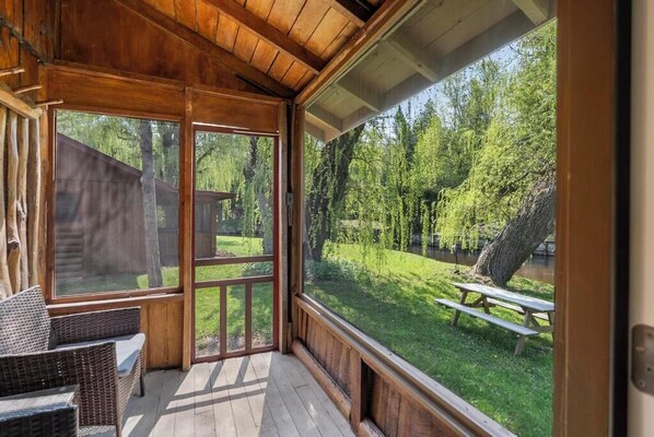 The cozy cabin is a perfect spot to visit May through October as the weather is wonderful. Please note we allow 6 guests, however, the futon is small in the living room. The Sturgeon River is very well known for it's fishing, especially in the Spring and the Fall. It is also the fastest flowing river in the lower peninsula of Michigan making it ideal for tubing and adventurous kayaking. The leaves changing in October is a -must see. You will have your own private firepit with chairs. We have worked hard to provide comfort, fun, beautiful grounds and service so that you can make life long memories.