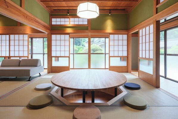 / Near Katori Shrine Enza is a traditional Japanese guesthouse Situated within the sacred precincts a stroll through the quiet village surrounded by the shrines woods takes about 20 minutes to reach Katori Shrine The property spans 1200 m2 with the building 200m2 At the center of the inn stands a 190cmdiameter sunken round table creating a natural gathering spot where large groups can sit in a circle A grand piano is placed in the living room