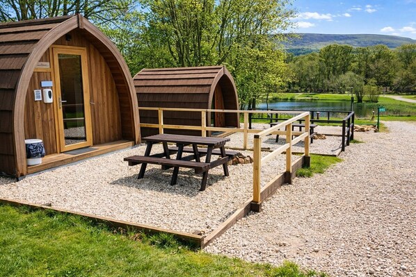 Each pod has a kitchenette with fridge, microwave and kettle. Outside is a small patio area with picnic table and fire pit.