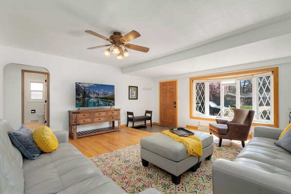 The main floor features 2 bedrooms and 1 bath off the living area with plenty of seating and large HDTV. The primary bedroom has a luxurious King bed and second bedroom has a Queen. The bathroom was recently remodeled with custom cabinetry, a stand alone tub and walk-in, tiled shower. The living area has a min-split A/C and the 2 bedrooms have window A/C units.