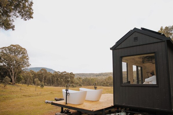 Drive 3.5 hours northwest of Sydney to discover Tiny Maggie, a serene escape nestled in the heart of NSW's wine region. Set in its own clearing and surrounded by dramatic rocky escarpments, Tiny Maggie invites you to unwind and find zen, with a glass of Australia’s finest wine in hand. Embrace the slower pace of life. Whether you're reading, reconnecting with nature or soaking in one of two outdoor bathtubs - Tiny Maggie is the first in our fleet to offer this unique feature.