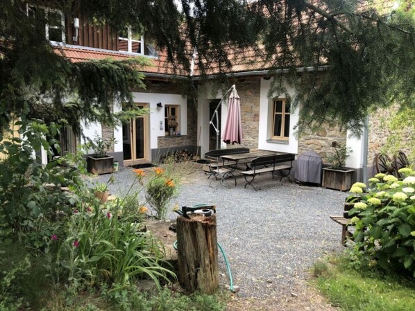 Relax in the nature with all comfort!The house is located in a small village of Morinka, 30 km from the very centre of Prague. The village is under the state protection as a national heritage. There is no active farming or industry and very little traffic as it is "no drive through" place. The house lies by a paved road and it is very easy accessible. The location is very good for both hiking in the surrounding nature and for going to Prague.The accommodation space is 160 m2, and consists of 2 apartments that are connected via a separate staircase. In addition, there is a separate bedroom with bathroom on the 1st floor. The ground floor apartment (nr. 1) has the entrance hall, bathroom with walk-in shower and a toilette, kitchen 16 sqm, living room with a sleeping sofa 14 sqm and a fire place, and two bedrooms with individual entrances, each approx. 9 sqm. One bedroom has two 80cm beds that can be put together or used as single beds, and the second bedroom has an Ikea guest bed and an elevated bed, perfect for children. The attic apartment (nr. 2) has a separate entrance. It features 1 bedroom with king-size bed, 1 bathroom with shower, sink and a toilette, 1 tea kitchen and 1 living room with dining corner. The room (nr. 3) has a guest bed 160x200, and it features a bathroom with walk-in shower and a toilette.The garden around the house has approx. 1300 sqm and it is mainly grass, flowers, bushes and trees. The yard features a dining table and two benches and a barbeque place. More garden furniture is in the garden.The place is very quiet and so is the neighborhood. Hence it is very good for people who want to relax in quiet. Family with children will appreciate the garden as well as the public playground in the village centre. Baby travelling bed is provided on request. The village is surrounded by woods, fields and meadows, so the place is ideal for hiking and biking. In Dobrichovice, 5 km away, is river Berounka with easy access for swimming. Boat rental is also avialable there. Castle Karlstejn is only 3 km away by walk, 5 km by car. The bus stop is only 300 m from the house and the bus goes one direction to Prague and the other to Revnice (5 km), where the train to Prague centre runs every 30 minutes.NEW: We can prepare a program for you according to your wishes and guide you. Please contact us for the offer!