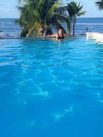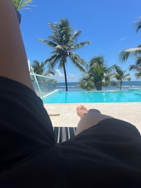 Pé na areia e piscina com vista para o mar