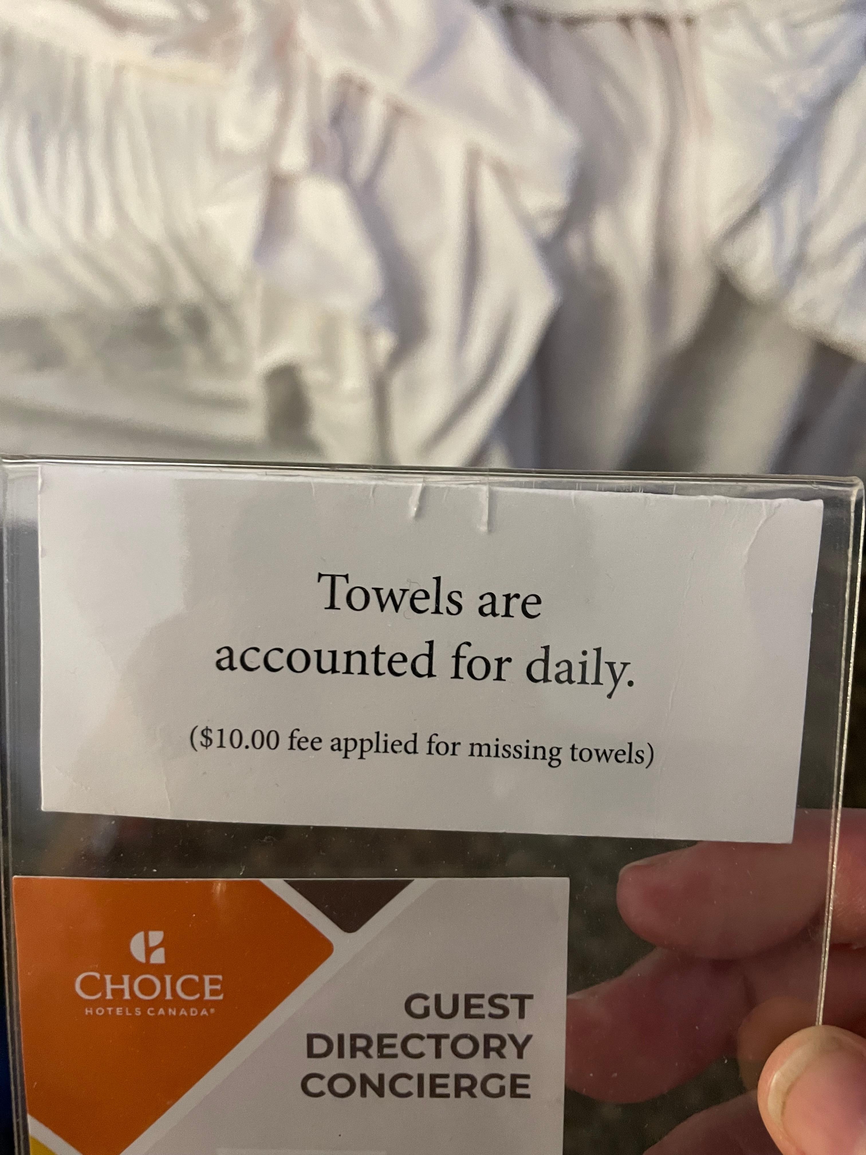 They charge extra for parking, ($25 day+HST) they have signs saying the count your towels and if any are missing your charged $10 for each one missing. Your charged $15 per night + tax for a resort fee and a $5 + tax a night for accommodation.