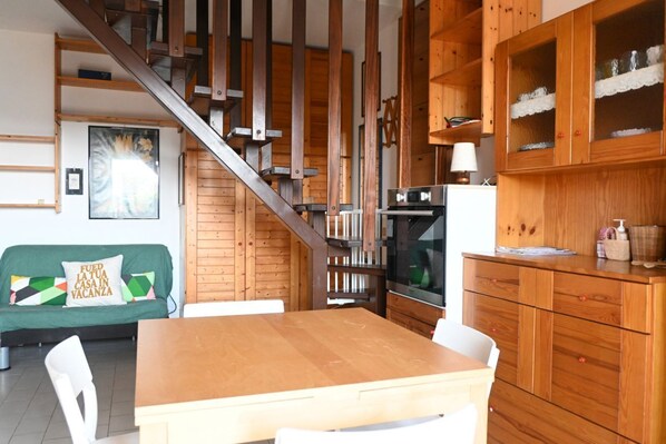 Description: Living room with kitchenette, dining table, and double sofa bed – an internal staircase leads to the bedroom with a double bed – bathroom with shower. Private terrace with table and chairs.