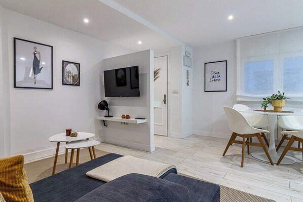 Sala de estar luminosa con Smart TV y zona de descanso.