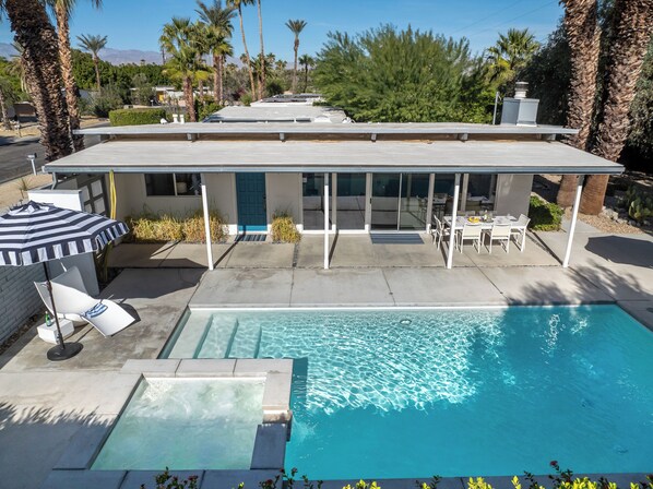 Esta propiedad captura la magia del glamour del sur de California. Fresco, actual y a la moda con una sutil elegancia discreta. El patio trasero en sí es un pedazo de cielo. Completamente amurallado y cerrado para mayor privacidad ... aislado, espacioso y bien planificado. La piscina enterrada es hermosa, con su superficie azul suave y su spa integrado. Las cómodas tumbonas, los sofás tapizados al aire libre y un pabellón cubierto para comer con sistema de nebulización son perfectos para los días de descanso junto a la piscina y las largas tardes bajo las estrellas. También encontrarás una increíble área de chat en la hoguera para calentarte durante esas noches frías del desierto.