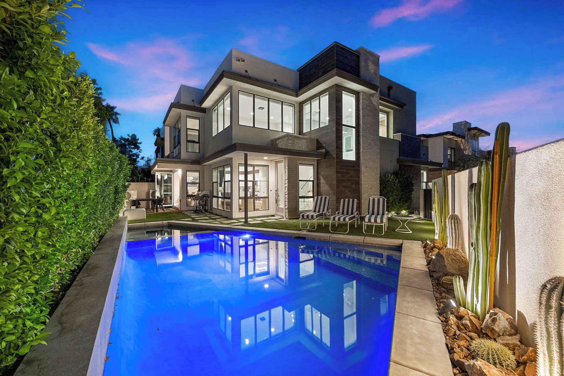 You'll also find an above-ground hot tub, a newly installed gas fire pit with a comfortable seating arrangement, an outdoor dining area for 8, natural gas Weber BBQ, and plenty of areas to relax, sunbathe or play under the endless desert sky. The lush green spaces, towering palms, and hedges create a tranquil, ultra-private oasis that is perfect for unwinding and creating lasting memories.