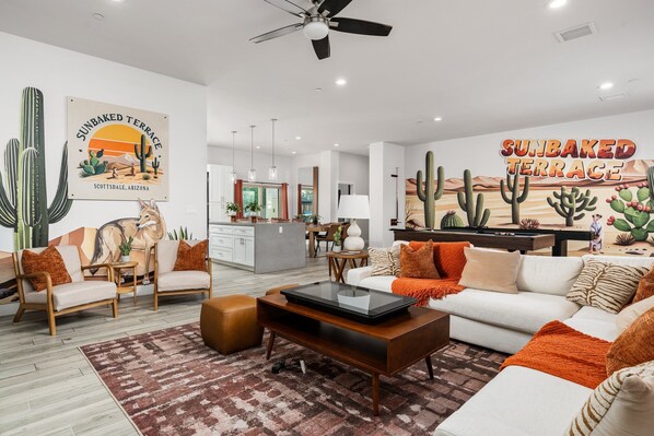 Throughout the house, playful murals and desert-inspired décor create a unique, memorable atmosphere you won't find in a standard rental.