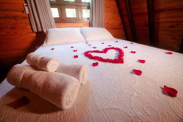 Aquesta cabana ofereix habitacions amb aire condicionat i que inclouen banyeres d'hidromassatge privades (cobertes) i una llar de foc. En aquesta cabana de 3 estrelles estrelles disposaràs d'una cuina equipada amb placa de cuina, microones i utensilis de cuina, vaixella i coberteria. El bany està equipat amb una dutxa. A més, hi trobaràs un bidet, articles de tocador gratuïts i assecador de cabells.