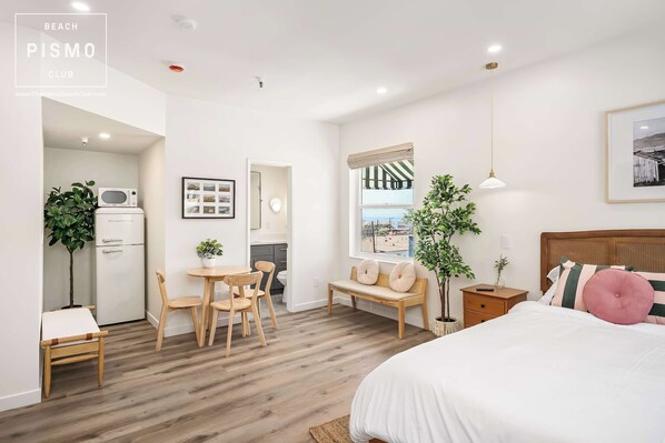 Our spacious suites feature luxurious California King Casper mattresses, organic cotton bedding, and a fully equipped kitchen for a home-away-from-home experience. Enjoy premium amenities like Malin + Goetz bath products and local artwork, all within walking distance of beautiful Pismo Beach.