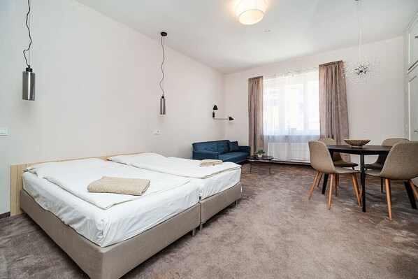 Enjoy a stylish and comfortable stay at this centrally-located studio apartment, fully equipped with everything you need for a relaxing holiday. You'll have access to a private balcony (located in the building's hallway), perfect for enjoying sunny days. The apartment is ideal for up to four people, featuring two double beds and cozy couches for lounging and relaxation.