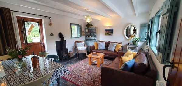 El acogedor salón tiene un piso de pizarra, techo con vigas de madera, persianas a medida y para esas noches acogedoras una estufa de leña. Además y para su entretenimiento, hay una gran televisión inteligente plana con Netflix, un reproductor de DVD y una radio Bluetooth. Una gama de libros, mapas y DVD también están disponibles dentro de la cabaña. También Wi-Fi de banda ancha de fibra gratis ilimitado.