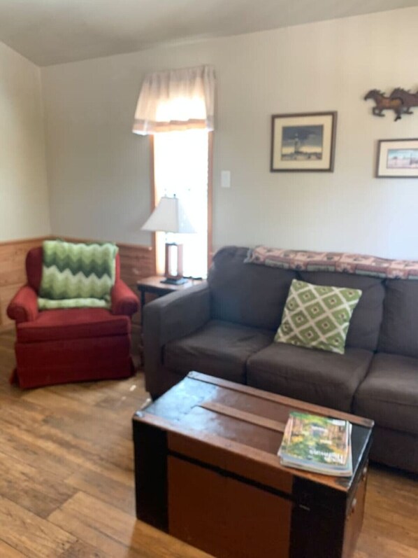 Queen bedroom with sleeper sofa in living room. Includes DIRECTV, WiFi, DVD player, fire pit, propane grill, fully furnished kitchen, towels, and linens. Front porch overlooks windmill and rock garden. Pets allowed.