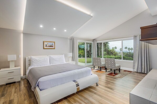 The West Wing Main Master Suite has double frosted glass door entrance with vaulted real wood beamed ceilings, 65" TV, fireplace, sliding glass door to balcony & pool area. Ensuite bathroom double vanity, shower and separate soaking tub. Right outside the Main Master Suite in the Large Hallway is Sauna Room for the whole house to enjoy on this hallway is the third & fourth bedroom.The third bedroom that faces the front of the property has 2 twin beds that can be pushed together to make another CalKing. The fourth bedroom is set up as an office with a sitting or standing desk, printer, along with full size mattress inside the white cabinet that is good short stay guests. The hall way also has a bathroom with shower. The Entry does have a powder bathroom. The backyard has breathtaking views of San Diego and Rancho Santa Fe. There is a hot tub & pool. Hot Tub & Pool heating is available at an additional fee during the stay.