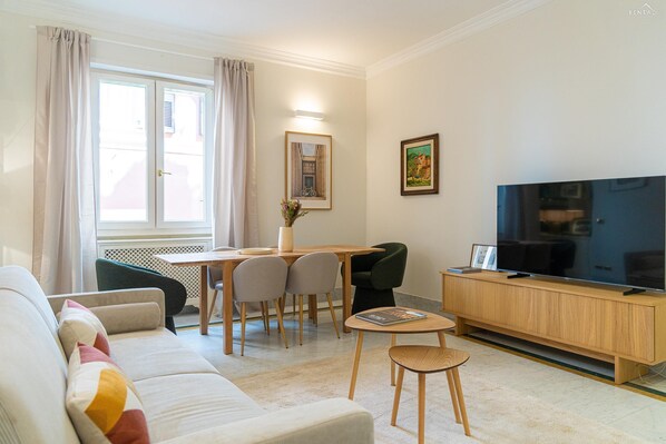 Elegant apartment located on Vicolo San Trifone, a short distance from Piazza Navona, Castel Sant'Angelo, and the Pantheon. Situated on the first floor (without an elevator) of a historic building, characteristic of Rome's historic center, in one of the most sought-after areas. A strategic location for exploring the city on foot, the area offers all kinds of amenities, including restaurants, bars, and shops. The famous Via dei Coronari is home to Rome's most important antique dealers. The apartment was recently renovated by a renowned architect, and elegance and comfort are its strong points. A stunning inlaid marble floor and high-design furnishings are the hallmarks of the property. Comprised of a spacious living room with a sofa and dining area, a large and separate fully equipped kitchen, two comfortable double bedrooms, and a spacious bathroom with shower, this stunning apartment is the ideal solution for families or friends seeking a stay in Rome combining comfort and elegance.