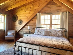 Perfect for two families or a small group, this 3-bedroom, 2-full bath modern log home on 20 private acres comfortably sleeps 6 guests among 2 king bedrooms, a bunk room with 2 twin bunk beds, and a queen-size sofa bed.