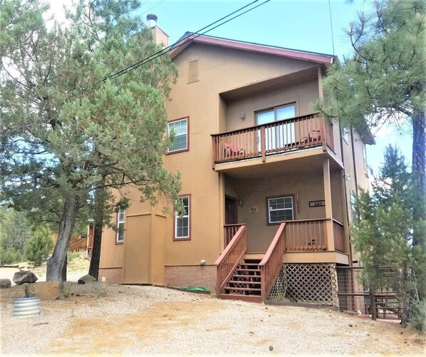 Escape to the cool pines and enjoy a great stay at Mountain Hideaway. This home features main level living, dining, kitchen, bath and laudry with 2 fireplaces and  Hot Tub on the Deck. Step out onto the spacious decks to enjoy the smell of the cool pines. Upstairs boasts 3 bedrooms, bath and two balconies. Make you reservations today!