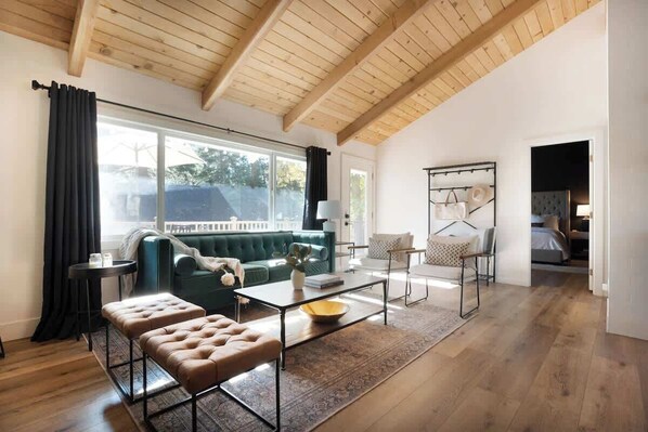 Our intimate living room and kitchen are cozy at every turn. Relax on our green velvet sofa, or take your pick among white armchairs and tufted leather benches. A huge picture window brings in an abundance of natural light. And French doors swing open to the deck, blurring the line between outdoors and in. As night falls, our wood-burning fireplace gives off a soft, romantic glow. Put on a movie or play a game from our collection – we have Uno, Scrabble, Cards Against Humanity and more. And yes! Fix yourself a cocktail at the bar cart (it’s BYO alcohol) as you settle in for another memorable evening.