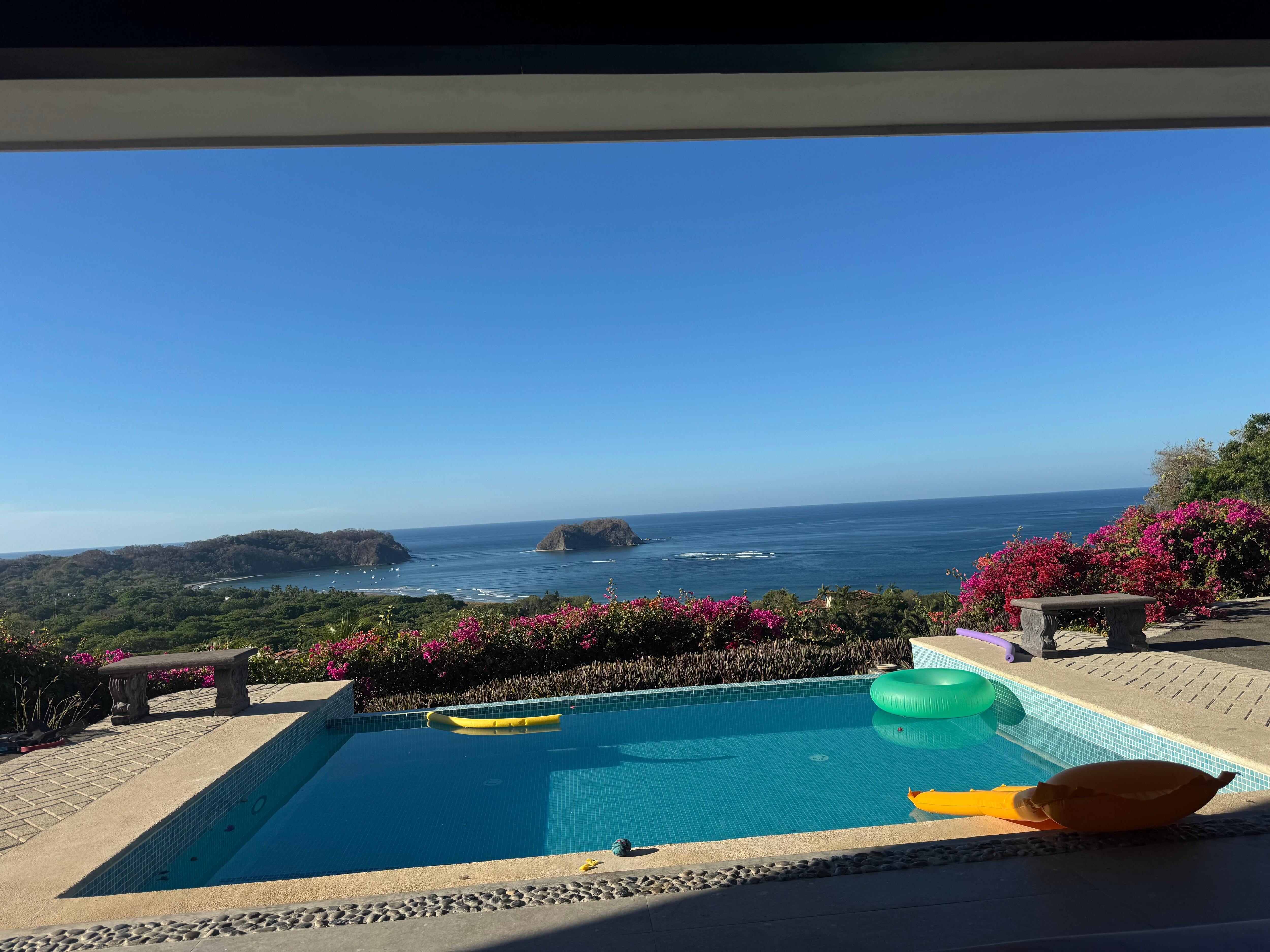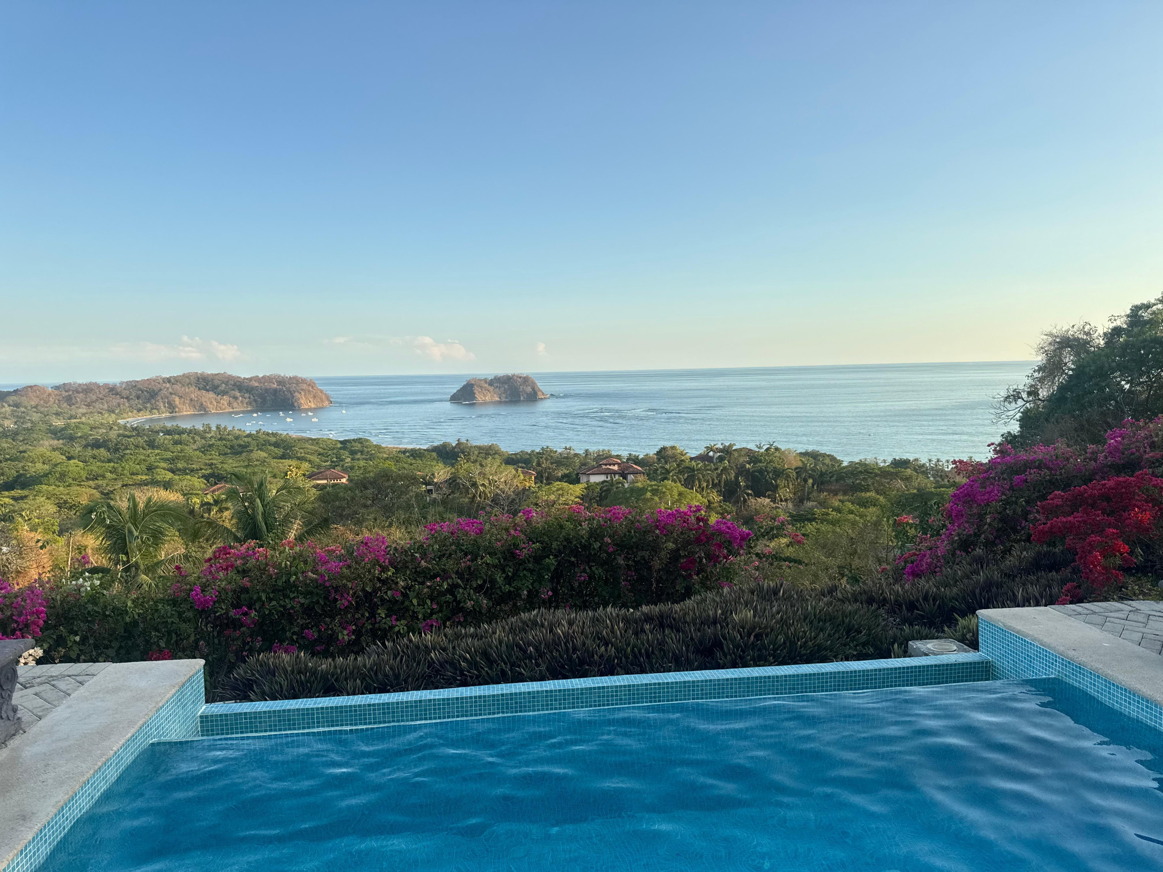 Built in 2016, a Costa Rican style contemporary villa, designed exclusively to encompass sweeping ocean and jungle views in all of its rooms! A sun lit, open and breezy central living area with 25 ft pitched ceiling with dark wood beams welcomes you. The brand new fully-equipped gourmet kitchen with granite countertops faces a 40 foot view facing wall comprised of 10 foot tall folding glass doors which open to an expansive covered terrace with an outdoor red cedar dining table, traditional Costa Rican rocking chairs and super comfortable, cushioned teak adjustable lounge chairs. Directly in front of the terrace is a refreshing aqua blue infinity pool and beyond that is the 180° panoramic view of white sands and the crystal clear waters of Samara and Carrillo Beaches, Isla Chora and the tip of the Nicoya Peninsula. Decorated with Costa Rican photos, pottery, and furniture. Appointed with ceiling fans throughout, including the terrace, as well as air conditioning in all bedrooms. The master bedroom offers a king size bed and oversized glass sliding doors with all-encompassing views, opening to a new terrace that surrounds the front , aqua infinity pool and oversized terrace. The master has an ensuite bath, with large ocean & jungle view windows and a roomy walk in closet. The spacious guest bedrooms have queen size beds, glass sliding doors, also with complete panoramic views, opening to the new terrace , aqua infinity pool and oversized terrace. The furniture within the home was custom crafted by a local artisan using wood from trees cleared for construction!