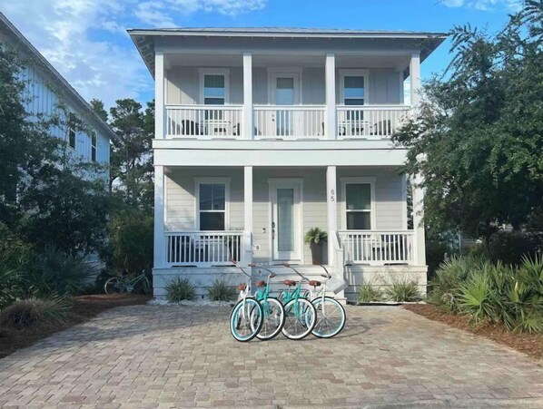 Enjoy time w/family and friends at this beautiful home in Highland Park, the most sought after community in Santa Rosa Beach on 30A. Relax inside with the modern yet comfortable furnishings, kick back in the shade on the 2-level front porch or relax under the covered pergola in the backyard. Enjoy the complimentary bikes on numerous trail and bike paths. End the day by throwing your favorite food on the grill as you make memories around the backyard fire pit. Located within walking distance to the beach and a great community pool, your dream home awaits! The space Bedrooms: King size primary bedroom with balcony, walk-in closet luxurious spa bath with dual sinks and large glass shower. Two additional queen size bedrooms with closet storage; beautiful large hall bath with soaking tub/shower combo; washer/dryer located on the second level.