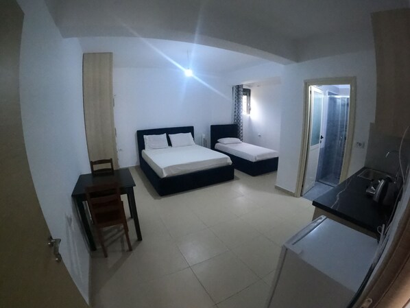 A special offer is nine apartments in one building located just outside Saranda on the exit road to Ksamil. We offer fully equipped apartments with separate bedrooms and a penthouse on the fourth floor with two bedrooms and a huge terrace with sun loungers, from which there is a panoramic view of the sea and mountains. Studio`s are located on the ground floor. Each apartment is air-conditioned and equipped with a bathroom with a shower, a kitchen with an electric stove and a refrigerator. This one is without balcony. Laundry and cleaning are included in the price as well as the tourist tax.