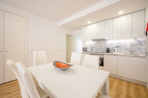 The kitchen provides a welcoming environment for socializing while cooking, including essential cookware, cutlery and a dining table for sharing meals together. A dishwasher and a washing machine are added for extra comfort.