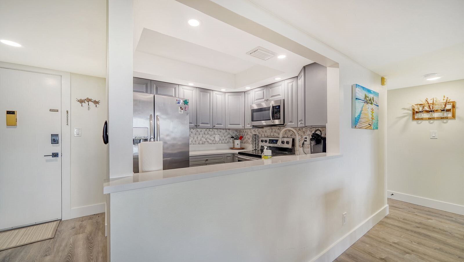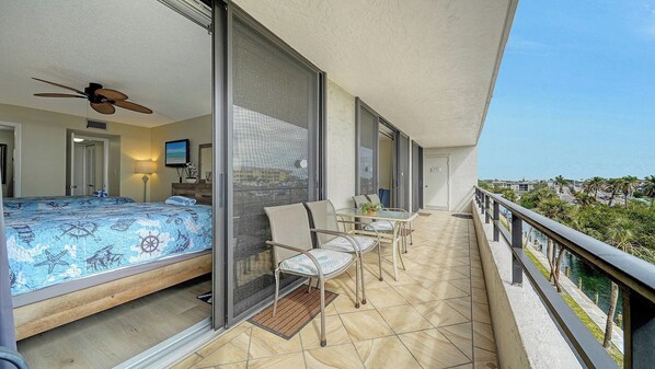 As you enter the home, the kitchen is the first thing you see with all of the necessities and upgraded cabinetry. As you cook here, you'll soon realize that having a full kitchen during vacation is very handy. Holiday meals or birthday celebrations are a breeze for this kitchen. The kitchen overlooks the living room which is the perfect spot to binge watch your favorite TV shows on large flat screen tv. Spend all night on the cozy couch catching up on all your guilty pleasures. Each bedroom here is fit for a king with flat screen tv's and ceiling fans! The large master bedroom has a king bed along with a newly remodeled walk-in shower ensuite bathroom, walk in closet and access to balcony. The newly decorated guestroom is outfitted with 2 queen beds, walk in closet and private access to balcony, reminiscent of the most luxurious hotel rooms. The guest bathroom is located right next to bedroom. New Hurricane tinted windows and sliding doors are in every room reducing sun glare and outside noise.