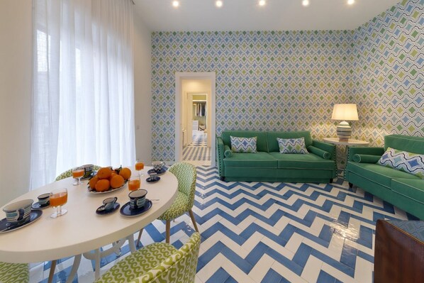 In the lounge area, upon entrance there is a strong impact in terms of the floor and the wallpapers as two different patterns have been used, again using green, white and blue core colors that are reflected and highlighted throughout the property. The style is very Mediterranean especially though the use of colors and design objects. The sofa cushions use the same unique pattern as the wallpaper which compliments the emerald green color of the sofa fabrics which are made of linen and produced by Romo Nara. The lamp also used the same core colors and was hand painted by a local company. You will also find a small table and chairs corner a great area where you can enjoy your breakfast, lunch or dinner. To complete the room there is a large television and a sophisticated and refined touch is given by the use of some key vintage and antique elements such as a nineteenth Century cupboard that was restored by a local Sorrento antique dealer.