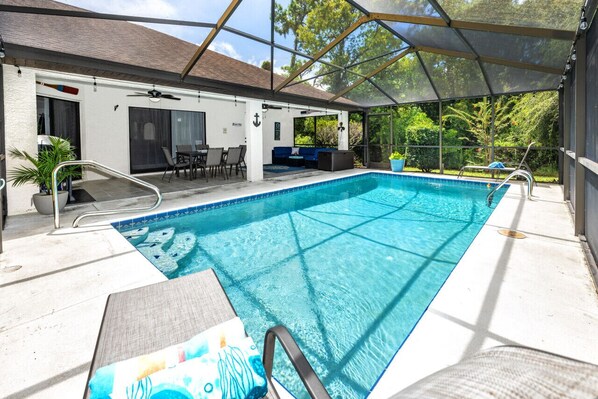 Head out back to the gorgeous HEATED POOL, fully fenced yard, and an expansive patio with sectional and grill.