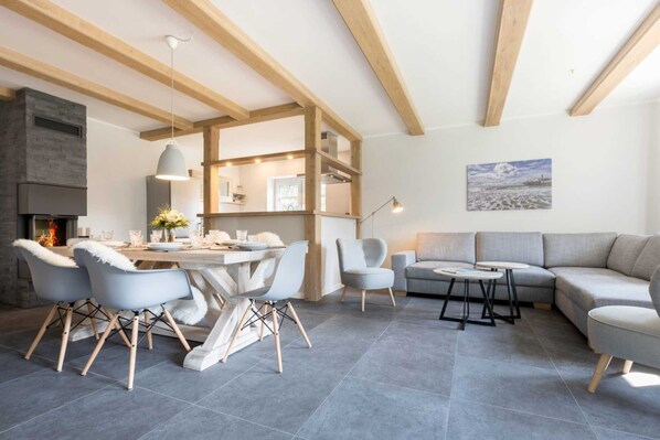 Living room with large corner sofa, armchairs, SMART TV (satellite), stereo with Bluetooth, cozy fireplace, dining table for 6 people and exit to the beautiful, furnished garden terrace to the southwest with beach chair. Modern, open kitchen with oven, microwave, dishwasher, induction hob and fridge-freezer.