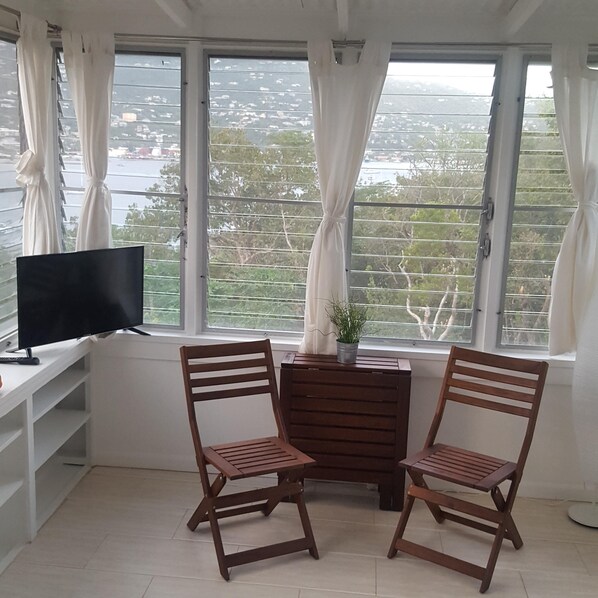 It is very easy to get to Water Island. After landing at Cyril E. King Airport in St. Thomas, take a quick taxi ride to Crown Bay Marina and then a 7 minute ferry ride to beautiful Water Island. The cozy studio at Bella Vita is ideal for up to 2 guests that are looking to experience the beauty of Water Island on a budget. Recently renovated, the studio is small, comprises approximately 250 sq ft with amazing water views of St. Thomas. There is an entrance to the unit from the lower driveway of the property, so there is privacy for all units. The studio has an open floor plan with efficient kitchen, queen bed, folding dining table & chairs, bathroom and shower. The bathroom is off of the kitchen and it open. The strong breeze keeps the studio cool, so A/C is not a necessity. It does have a A/C unit. We just ask that you turn it You have an option to rent a golf cart on Water Island. Just let me know you have an interest.
